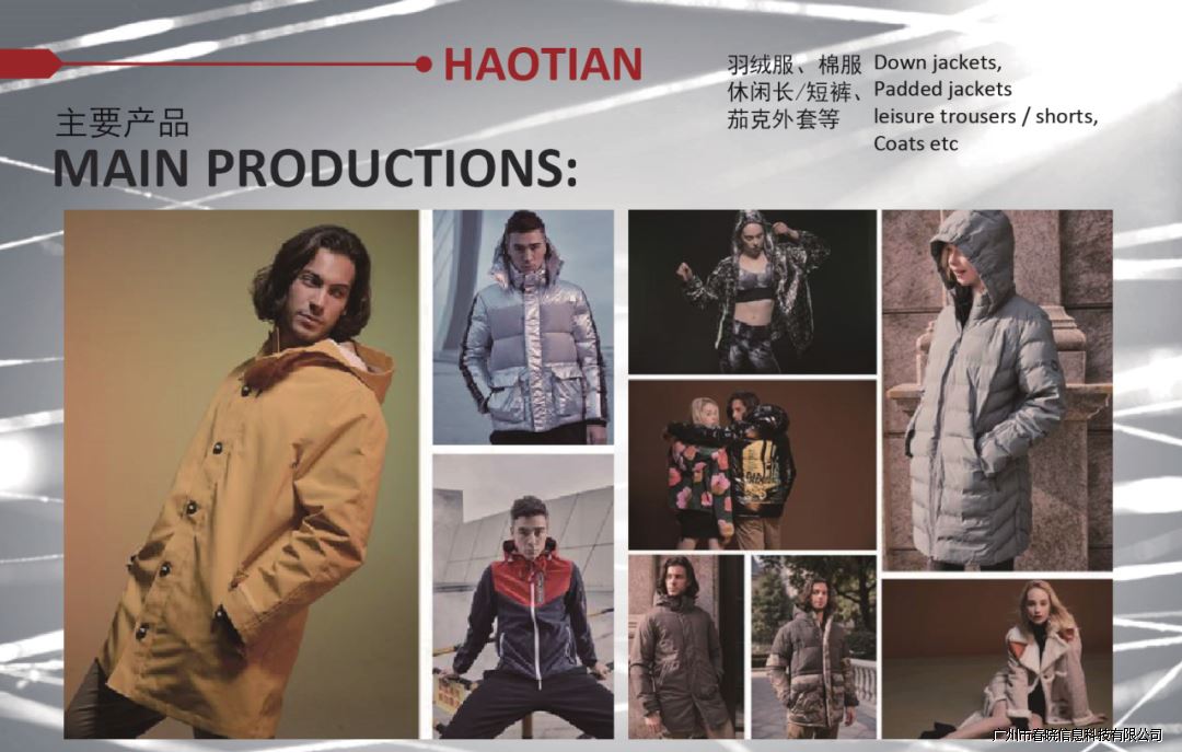 南京昊天制衣是江苏华利达集团的合资子公司之一,公司主营业务为梭织服装,目前是国内最大的羽绒服加工型企业,现有生产线30余条和一个多功能水洗车间,员工2000余人,是目前南京市区域内规模最大的服装生产厂家之一,合作的客户包括:优衣库、波司登、菲乐、沃尔玛、H&M361等。